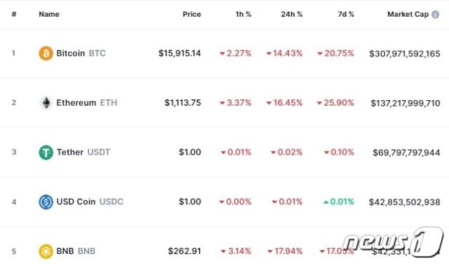 10일 오전 7시 현재(한국시간 기준) 비트코인은 글로벌 코인시황 중계사이트인 코인마켓캡에서 24시간 전보다 14.43% 폭락한 1만5915달러를 기록하고 있다.