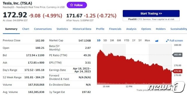 이날 테슬라는 전거래일보다 4.99% 급락한 172.92 달러를 기록했다. 테슬라의 주가가 170달러 대로 밀린 것은 1월 31일 이후 처음이다.